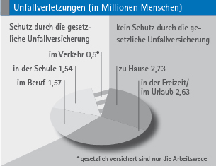 Eine Million Menschen werden so schwer verletzt, dass sie im Krankenhaus behandelt werden müssen. Etwa 21 % der Unfälle ereignen sich bei der  Arbeit, rund 30 % im Haus, 23 % der Unfälle passieren beim Spielen und Sporttreiben, 18 % im Verkehr, 7 % der Unfälle werden als „sonstige Unfälle“ bezeichnet. Nach unterschiedlichen Schätzungen waren 30 bis 50 % aller Unfälle durch gezielte und wirksame Vorkehrungen zu verhindern.