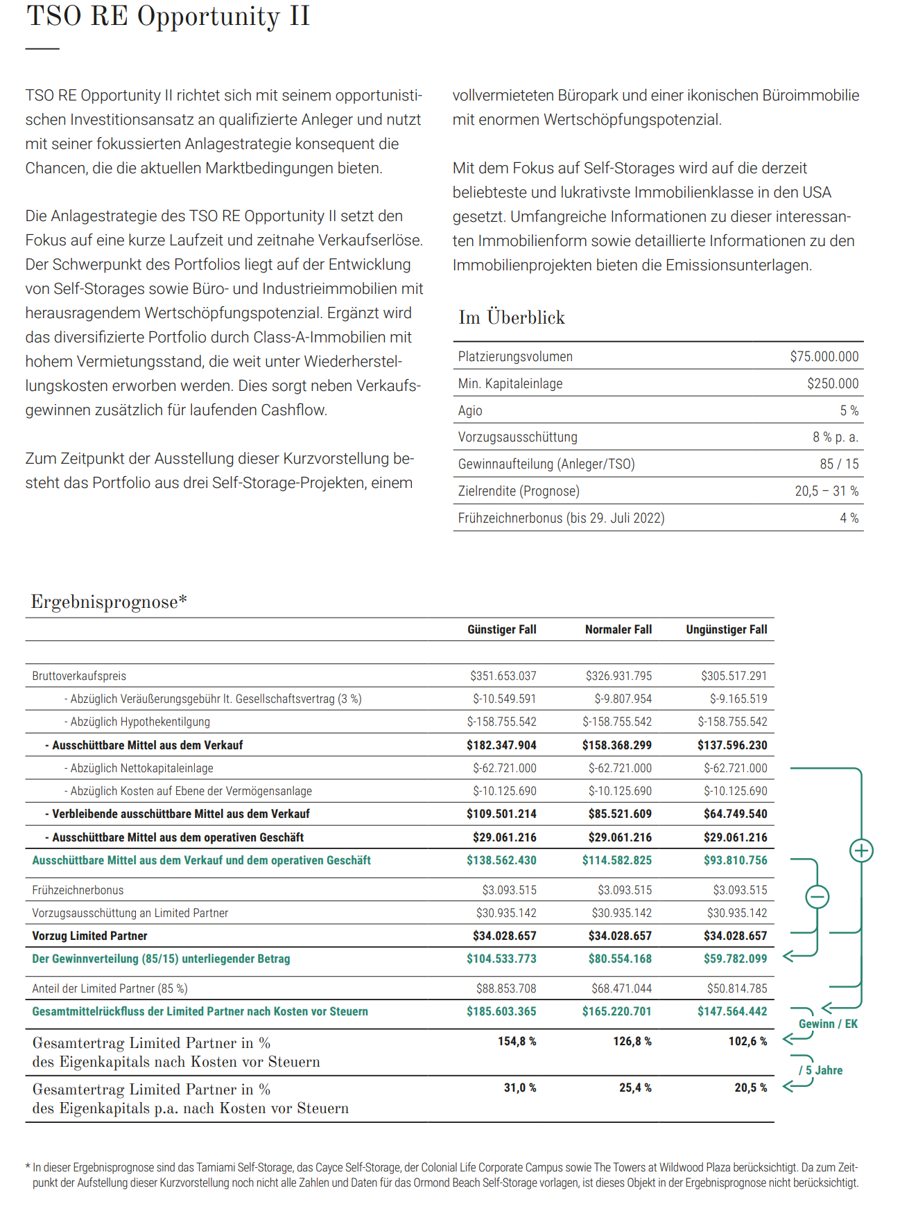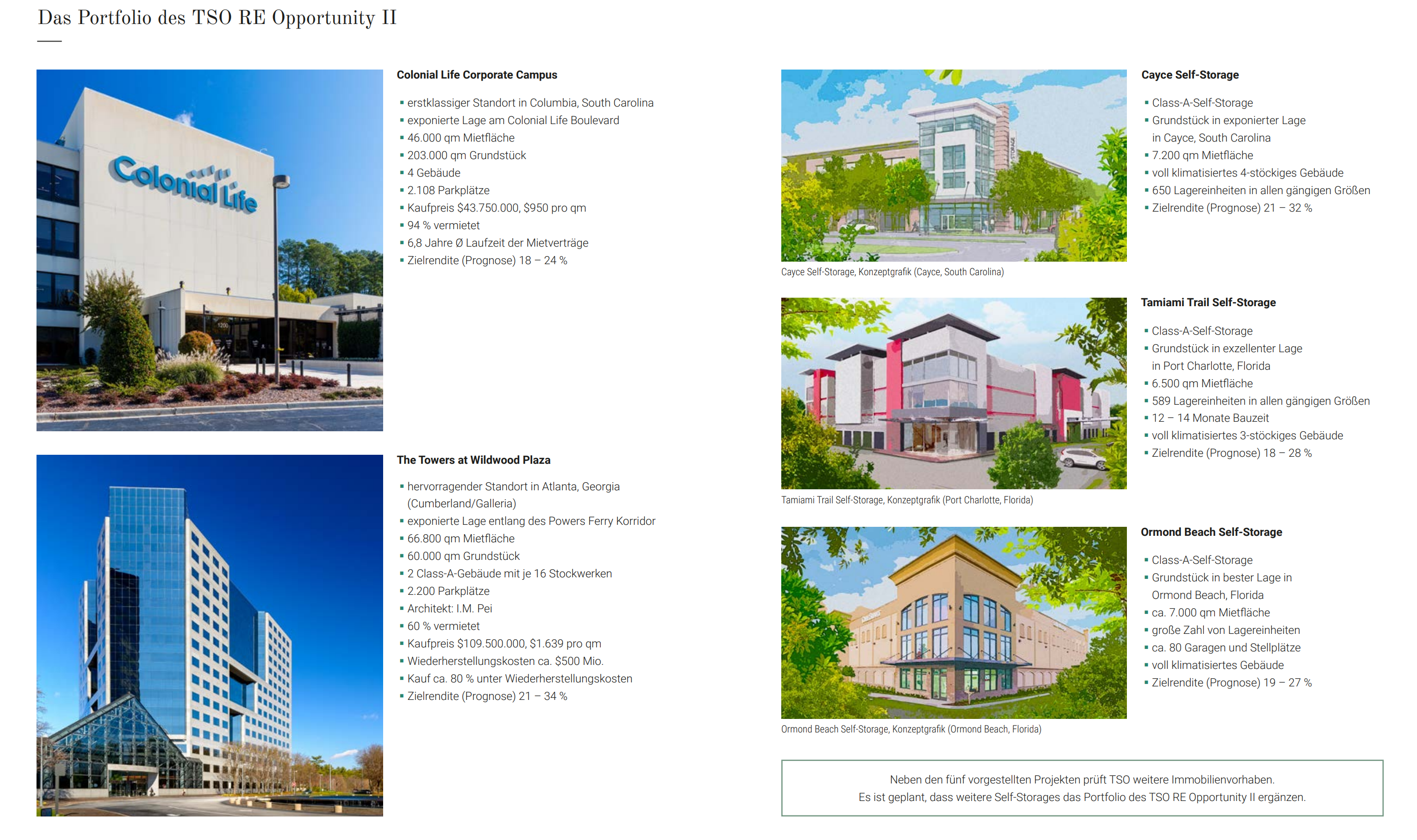 Mit dem TSO Active Property IV setzt TSO die bewährte Anlagestrategie fort. Im Vordergrund steht der Aufbau eines diversifizierten Portfolios aus Gewerbeimmobilien (speziell Büro und Self-Storage) sowie einem Multifamily-Objekt. Zielregion ist wie stets der Südosten der USA, der sich durch nachhaltiges Bevölkerungswachstum und regen Unternehmenszuzug als Motor der US-Wirtschaft etabliert hat. TSO ist auf diesem Markt seit Jahren präsent und arbeitet mit den wichtigsten Akteuren zusammen. Die bisherigen Erfolge sind vor allem auf die Nähe zu den Objekten und den Mietern sowie die jahrzehntelange Erfahrung in dieser Region zurückzuführen.